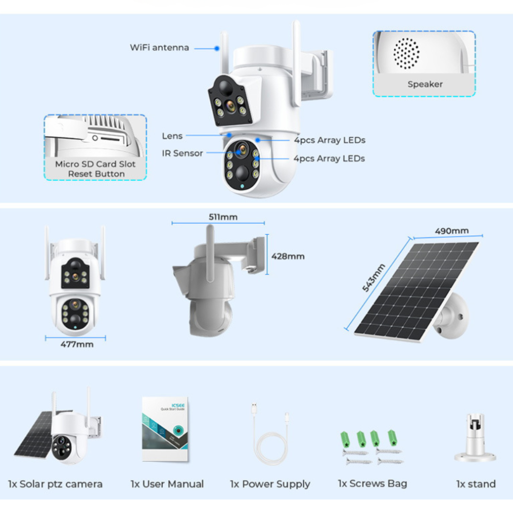Equipped with both a fixed-angle lens for a wide field of view and a 3.6 mm PTZ (Pan/Tilt/Zoom) lens for precise zoomed-in detail, this camera provides near-complete panoramic coverage with up to 320° of horizontal rotation. View both video streams simultaneously in the ICSee app for full situational awareness, whether you’re monitoring your home or a remote destination.